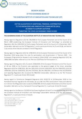 • GB Decision 14/2020: ON THE ALLOCATION OF ADDITIONAL FINANCIAL CONTRIBUTION TO THE KNOWLEDGE AND INNOVATION COMMUNITIES (KICs)