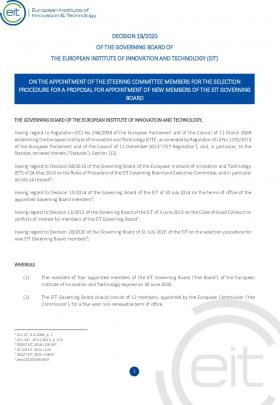 • GB Decision 19/2020 ON THE APPOINTMENT OF THE STEERING COMMITTEE MEMBERS FOR THE SELECTION PROCEDURE FOR A PROPOSAL FOR APPOINTMENT OF NEW MEMBERS OF THE EIT GOVERNING BOARD