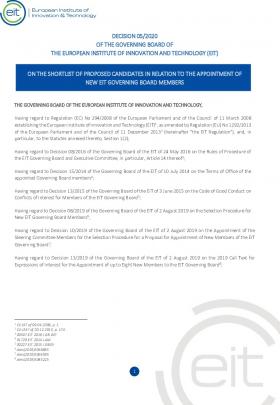 • GB Decision 05/2020 ON THE SHORTLIST OF PROPOSED CANDIDATES IN RELATION TO THE APPOINTMENT OF NEW EIT GOVERNING BOARD MEMBERS