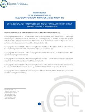 • GB Decision 20/2020 ON THE 2020 CALL TEXT FOR EXPRESSIONS OF INTEREST FOR THE APPOINTMENT OF NEW MEMBERS TO THE EIT GOVERNING BOARD