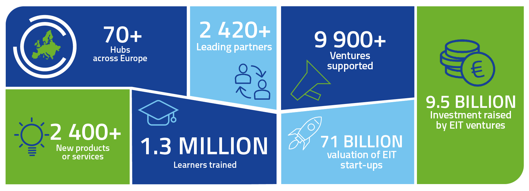Together with their leading partners, the EIT Community offers a wide range of innovation and entrepreneurship activities across Europe: entrepreneurial education courses, business creation and acceleration services, and innovation-driven research projects. To date, these have resulted in: