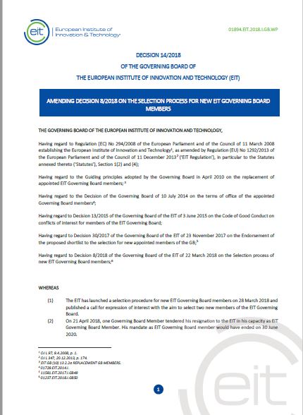 (1) The EIT has launched a selection procedure for new EIT Governing Board members on 28 March 2018 and published a call for expression of interest with the aim to select two new members of the EIT Governing Board.