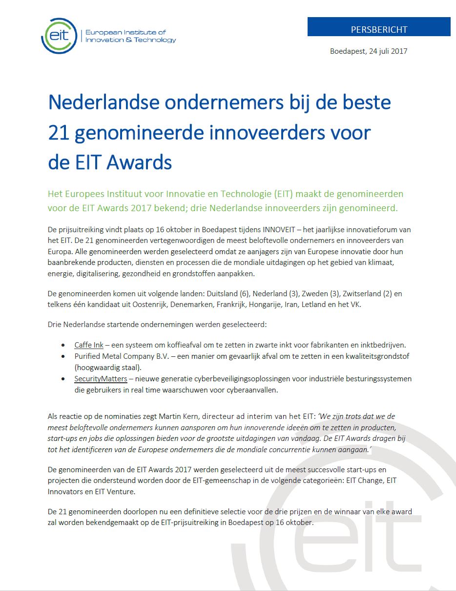 Het Europees Instituut voor Innovatie en Technologie (EIT) maakt de genomineerden voor de EIT Awards 2017 bekend; drie Nederlandse innoveerders zijn genomineerd.