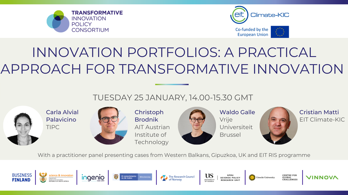 “Innovation portfolios, a practical approach to navigate transformative innovation” is happening online on 25 January 2022 from 15:00 to 16:30 CET and is co-organised by the Transformative Innovation Policy Consortium (TIPC). In the workshop, we will learn when, how and why to use innovation portfolios, looking at real life cases from the Western Balkans, Gipuzkoa, the Regional Innovation Scheme (RIS) programme and other multi-location initiatives supported by EIT Climate-KIC.