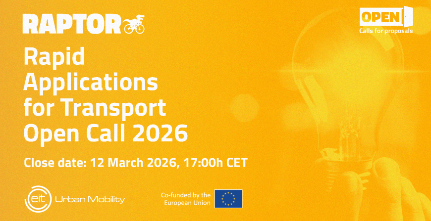 Join the new Rapid Applications for Transport Open Call 2026!RAPTOR is EIT Urban Mobility’s rapid piloting programme designed to address concrete urban mobility challenges through fast and focused collaboration between cities and innovators. Participating cities define a specific challenge link ...